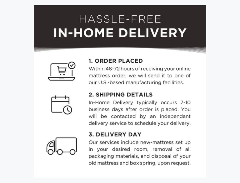 Professional delivery in 1-2 weeks. Inside setup and old mattress removal included.